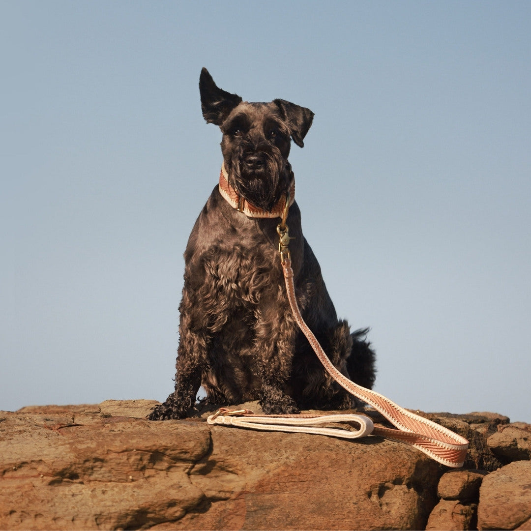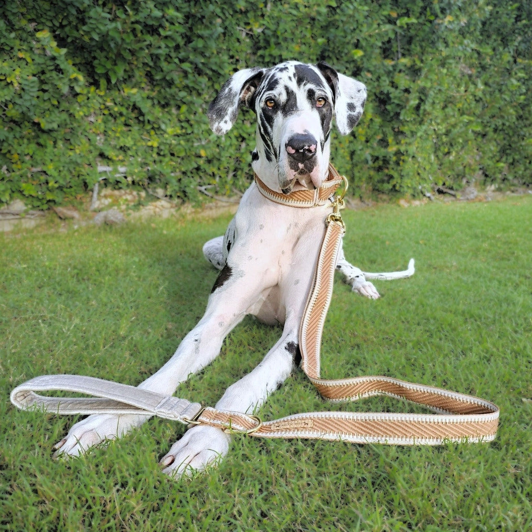 Our Caramel Latte St Tropez Statement Leads are made from a durable 38mm wide polyester webbing, and solid brass hardware with an anti-oxidation treatment, perfect for any adventure!