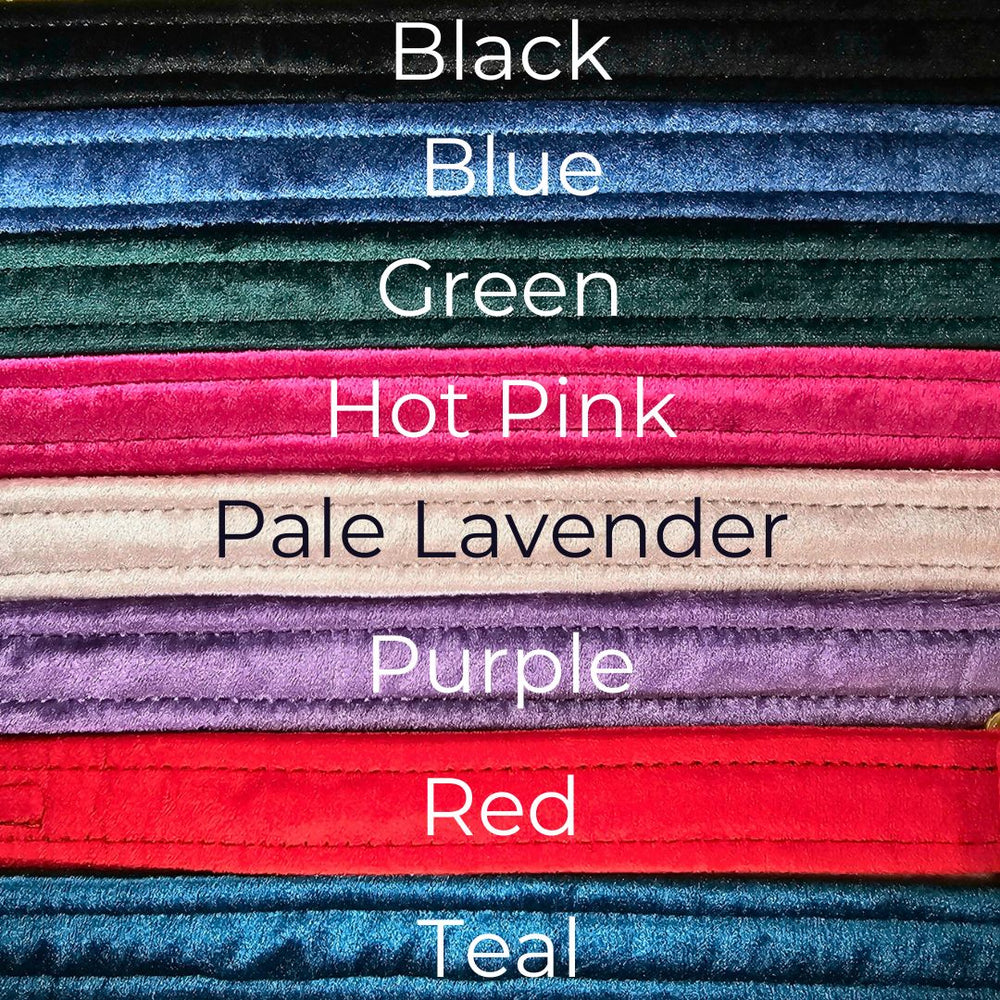 Our velvet harnesses are 25mm (1") wide, and are available in the following standard sizes: