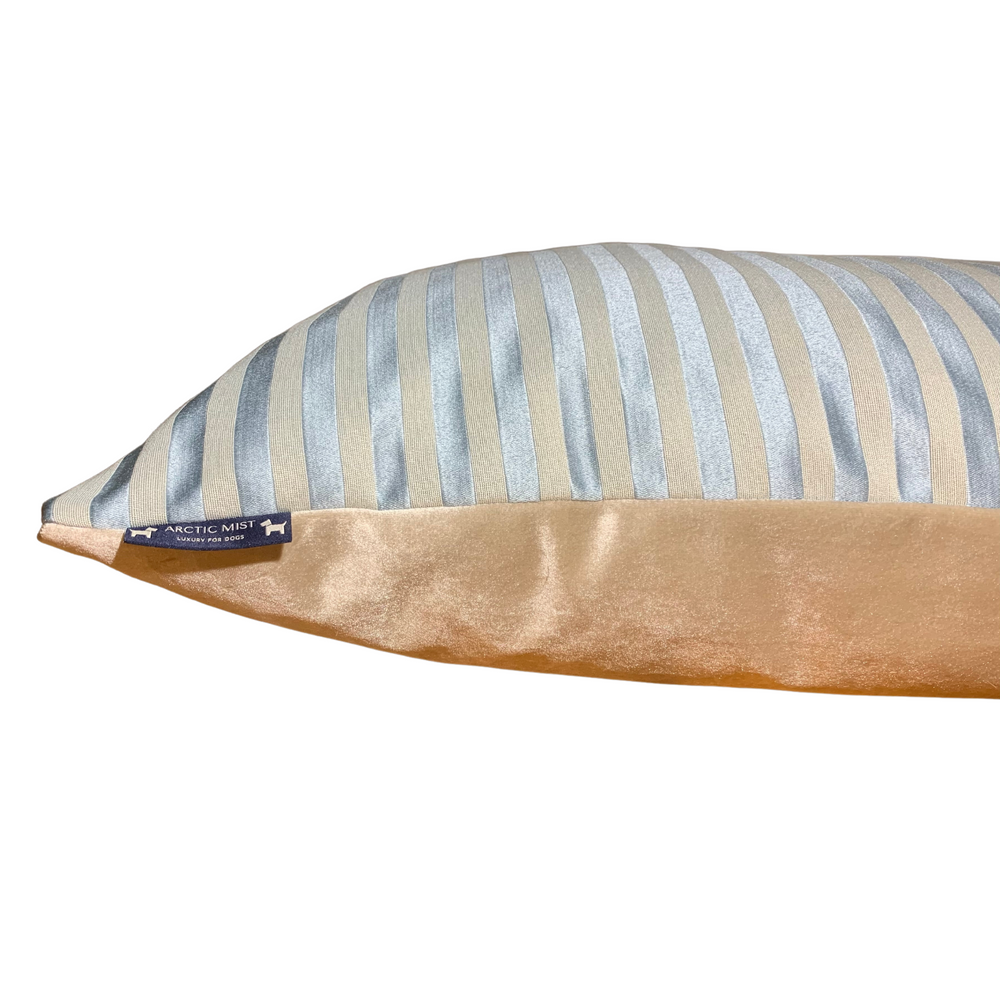 The Pastel Sapphire bed features a luxurious commercial quality champagne coloured upholstery velvet and beautiful champagne and sky blue stripe upholstery fabric. This bed is in stock and available in three sizes: