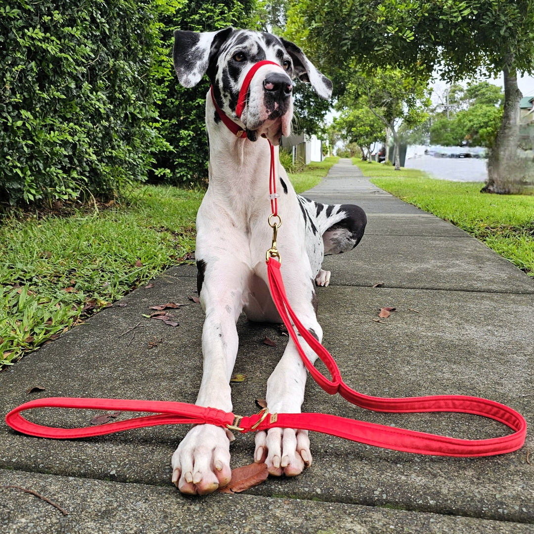 Luxury Red Velvet dog lead. Handmade by us in Brisbane and include:
