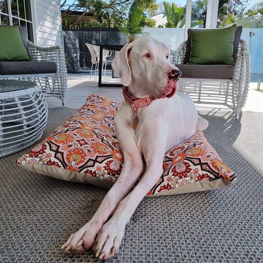 The Bohemian outdoor bed is made from a weather resistant polyester canvas. It features an ornate bohemian pattern and plain taupe canvas. This bed is in stock and available in size Large (pictured):