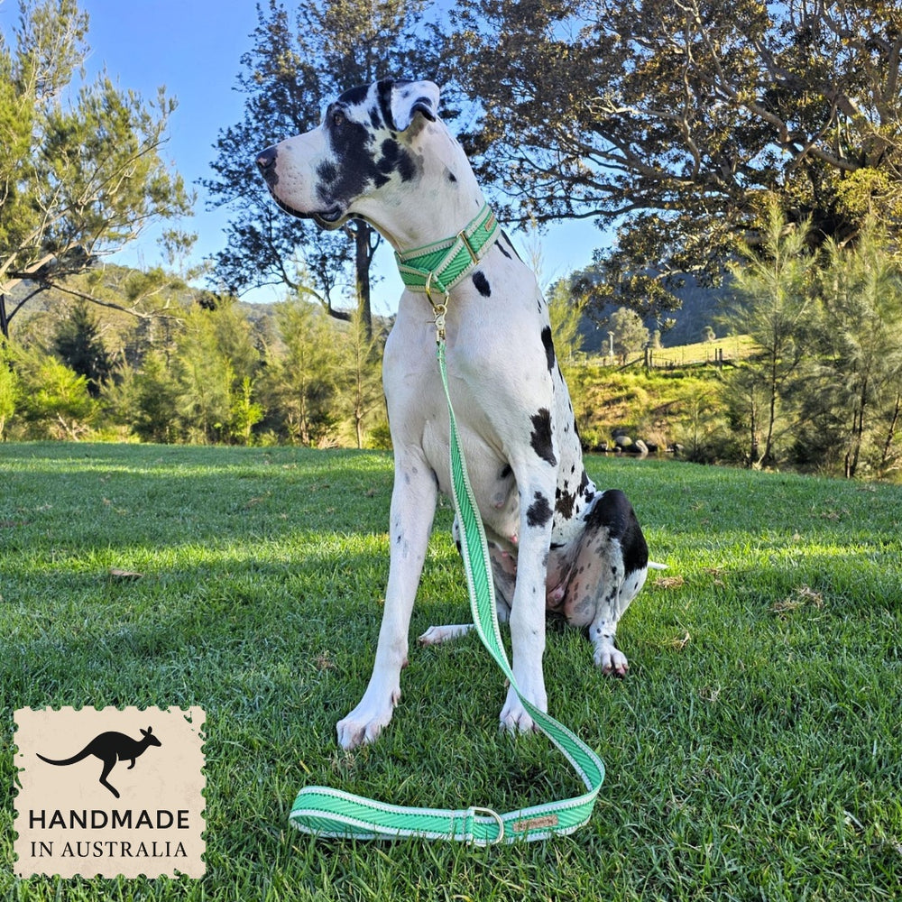 Our Emerald Green St Tropez Statement Leads are made from a durable 38mm wide polyester webbing, and solid brass hardware with an anti-oxidation treatment, perfect for any adventure!