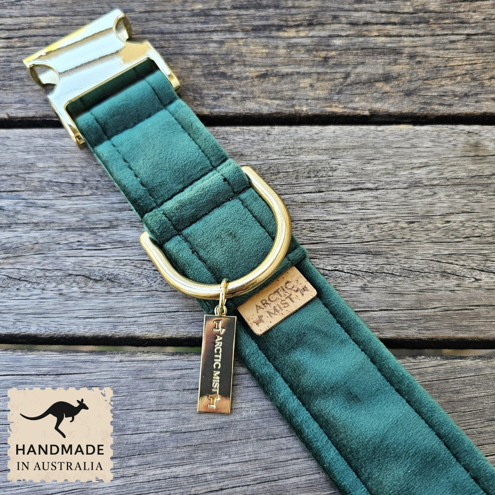 Luxury Forest Green velvet buckle collar for dogs. Handmade by us in Brisbane and include: