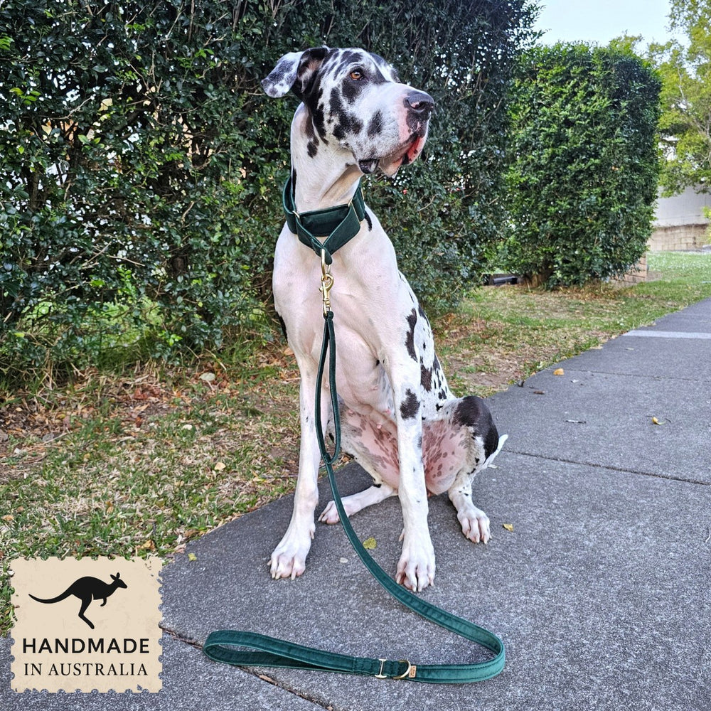 Luxury Forest Green Velvet dog lead. Handmade by us in Brisbane and include: