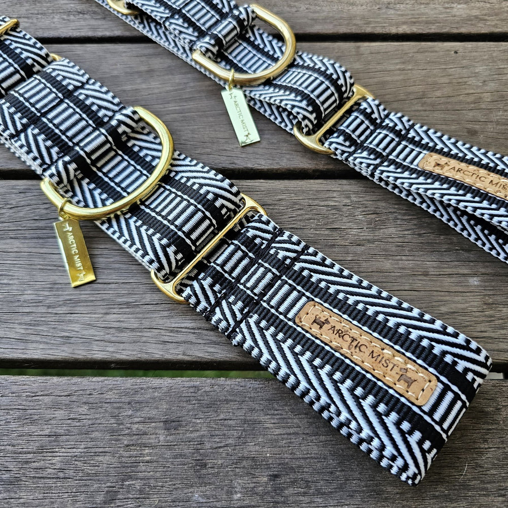 Our Adjustable Aztec Martingale Dog Collar is made from a durable polyester webbing, and solid brass hardware with an anti-oxidation treatment, perfect for any adventure!